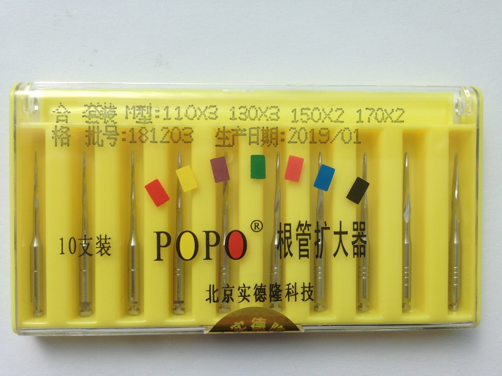 根管扩大器产品整体由不锈钢制成,由前端工作部分和后端操作部分组成。主要用于建立根管通道和扩大牙齿根管冠状部分的开口,产品配合牙科手机使用,作为根管的预备孔加工工具使用,不得用于其它用途。